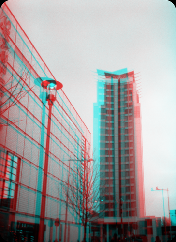 Taken just to the side of John Lewis whose large building dominates the right of the image the attention grabber however is in the distance the striking building of the Radisson Blu Hotel Cardiff the Hotel sky scraper 1 of the 2 Meridian Gate buildings, the other being for a small building for apartments. This building is next to the Altolusso both buildings are impressive in there visual architecture and completely different in appearance and nature. As a stereo photo it creates an great sense of depth having such a towering structure in the distance with John Lewis following the perspective. Such an image is quite unremarkable in 2D but really comes into its own in a stereo image where different compositional rules apply.