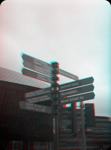 Taken by the traffic light in front of the Wales Millennium Centre WMC for short or more un-affectionately known as the slug. I enjoy taking pictures of fingerposts they work extremely well in 3d. They also provide a whole host of possibilities depending which direction you venture towards. For example if you were to go in the direction of the lone fingerboard you would end up in the Roald Dahl plaza, Where many great events take place including the Cardiff food festival, Maritime festival and there has even been a circus held in this amazing space.